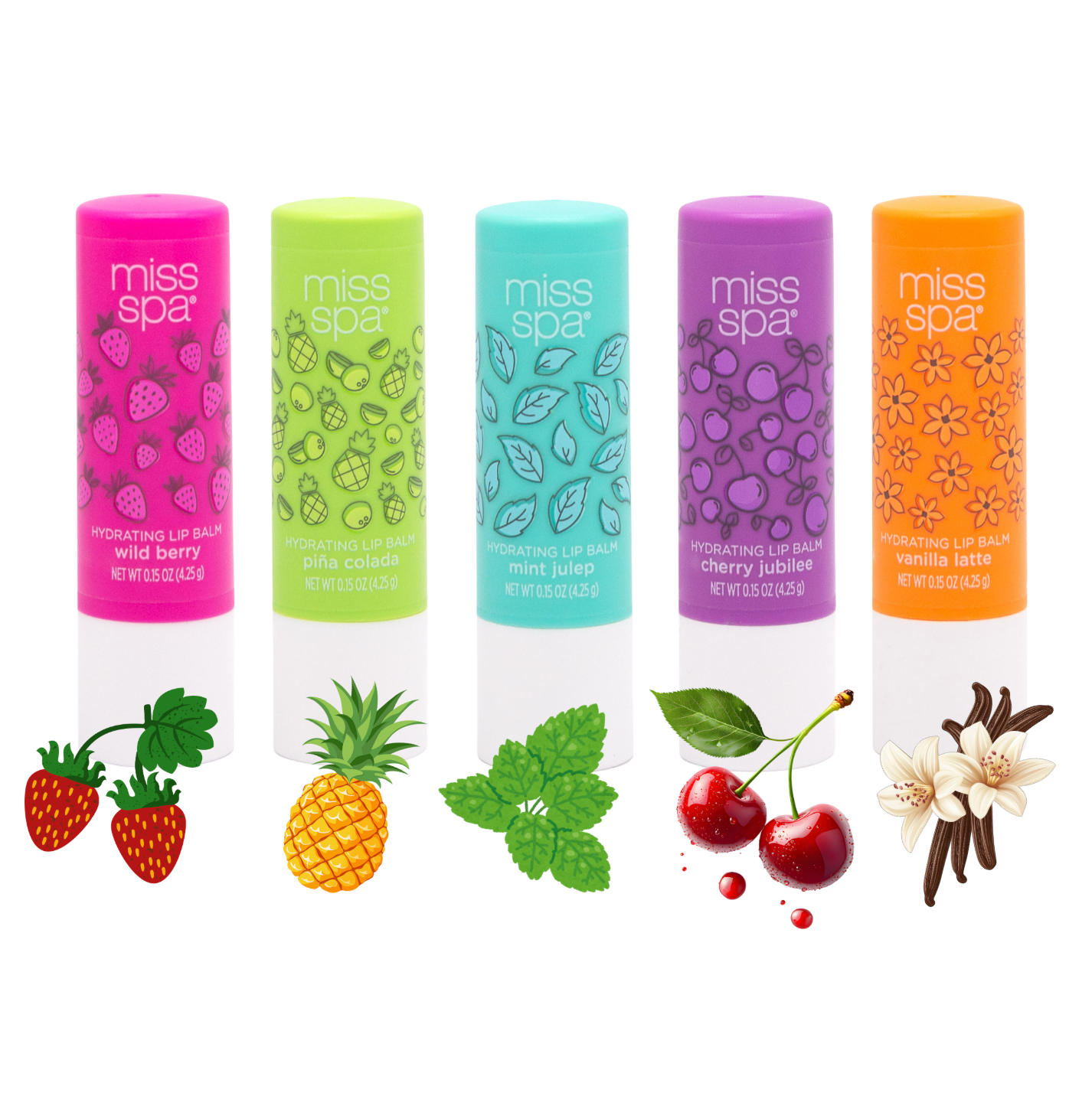 Treat your lips to the ultimate self-care experience with Miss Spa’s Hydrating Lip Balm Bundle, featuring five mouth-watering flavors — Wild Berry, Piña Colada, Mint Julep, Cherry Jubilee, and Vanilla Latte.